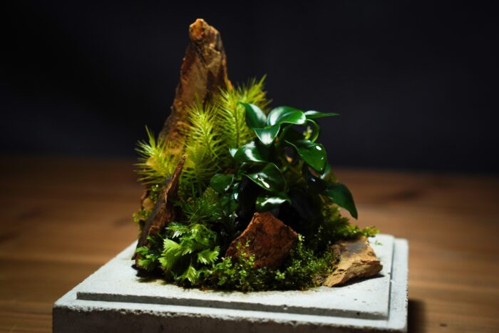 特製のセメント台座にダイナミックに囲む気孔石、瑞々しいアヌビアスナナと3種類の苔をバランスよくレイアウト。